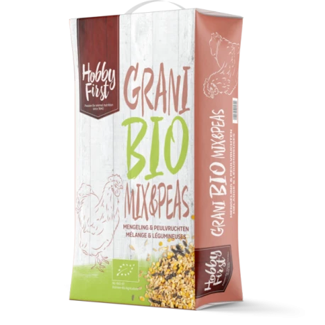 Grani Bio Mix & Peas est composĂ© de graines et de grains issus de la culture biologique (sans utilisation de pesticides chimiques et sans engrais artificiel) et est 100% vĂ©gĂ©tal. Grani Bio Mix & Peas est un mĂ©lange variĂ© de maĂŻs concassĂ© et de diverses autres cĂ©rĂ©ales et graines, mais sans soja ni pellets. L’ajout de pois et de lupins augmente la teneur en protĂ©ines de manière tout Ă fait naturelle et stimule ainsi la ponte.